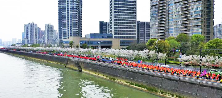 细雨纷飞,樱花烂漫,阳春三月的杭州处处涌动着勃勃生机。3月31日,第二届杭州国际樱花徒步节在滨江区钱江龙射潮广场盛大启动,5000余名徒步爱好者在钱江南岸十里樱花丛中浪漫开走,蒙蒙细雨相伴,人潮、花海,相映成趣。